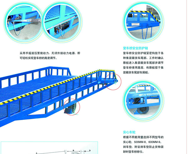移動式登車橋是與叉車配合使用的貨物裝卸輔助設(shè)備,可根據(jù)貨車車廂的高低調(diào)節(jié)高度,叉車可以直接通過本設(shè)備駛?cè)胲噹麅?nèi)部進(jìn)行貨物的批量裝卸,僅需單人作業(yè),即可實(shí)現(xiàn)貨物的快速裝卸。它的菱形網(wǎng)狀結(jié)構(gòu),充分保證了卓越的防滑性能,使叉車有極好的爬坡性和可操縱性。即使在雨、雪天氣,仍能保證正常使用。它的可調(diào)節(jié)長度的索鏈能方便地鉤住貨車,使登車橋與貨車始終緊密貼合。采用手搖液壓泵作動力,不需外接動力電源即可輕松實(shí)現(xiàn)登車橋的高度調(diào)節(jié)。配置的剎車墊可有效防止貨車裝卸時登車橋移位。